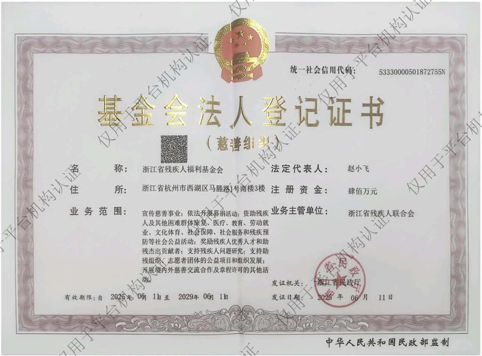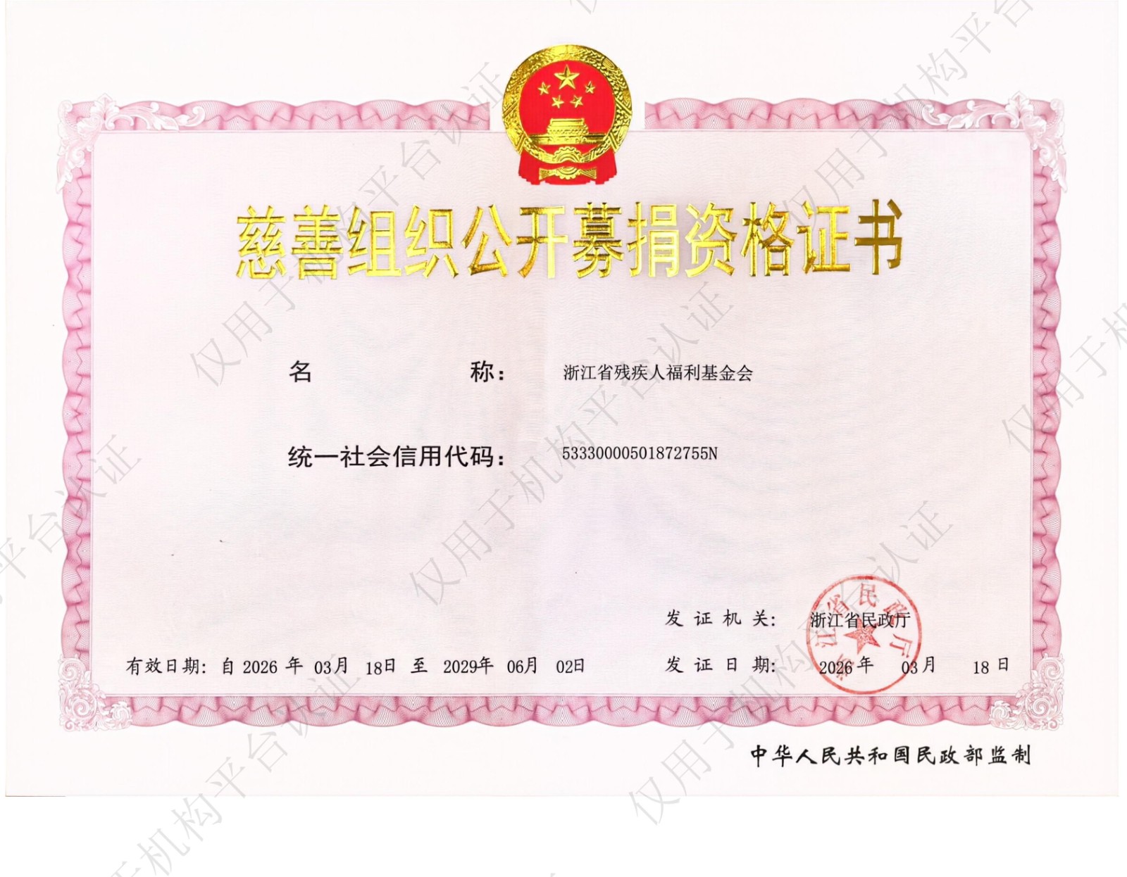 浙江省残疾人福利基金会是浙江省唯一一家以 300 多万残疾人为扶助对象的全省性公募基金会,宗旨是“弘扬人道、奉献爱心,全心全意为残疾人及其他困难群体服务”。自1985 年成立以来,基金会在党和政府以及社会各界的大力支持下,打造了多个助残品牌项目,覆盖残疾人康复、教育、就业、文化、体育等各个方面。共募集善款善物总价5亿余元,救助贫困残疾人100余万人次,为广大残疾人带来了实实在在的帮助。