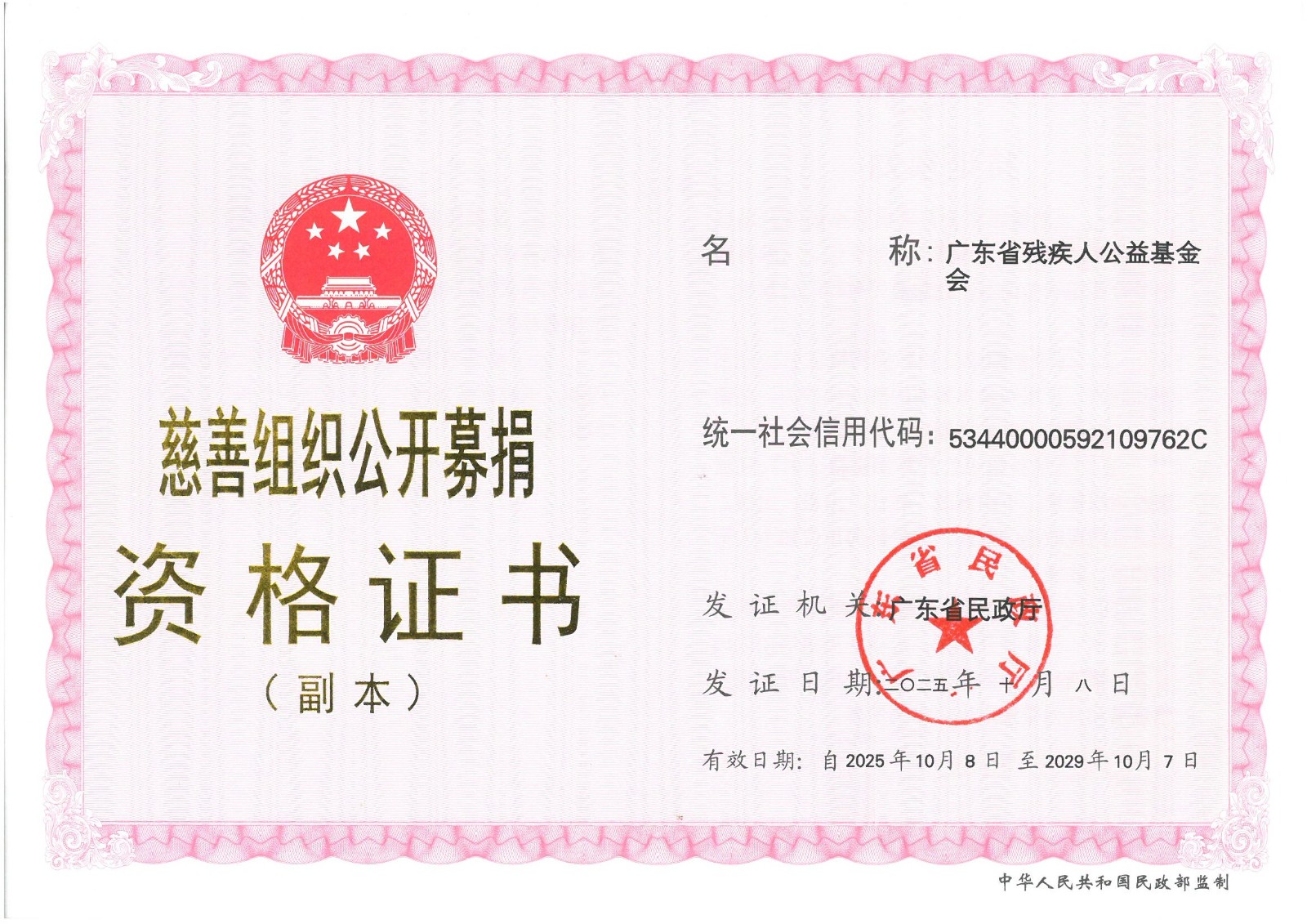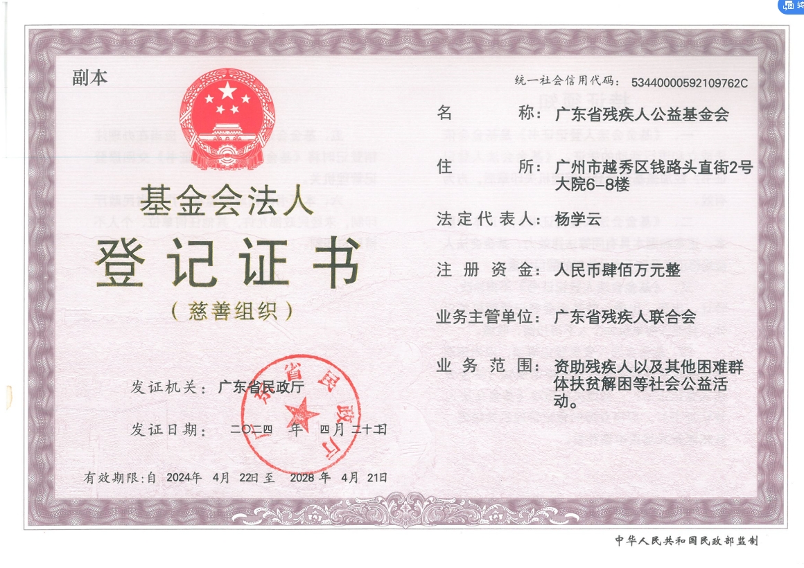 广东省残疾人公益基金会(以下简称“我会”)是2012年3月5日经广东省民政厅同意设立的公募慈善组织,具有基金会法人资格,非营利组织免税资格,业务主管单位为广东省残疾人联合会。