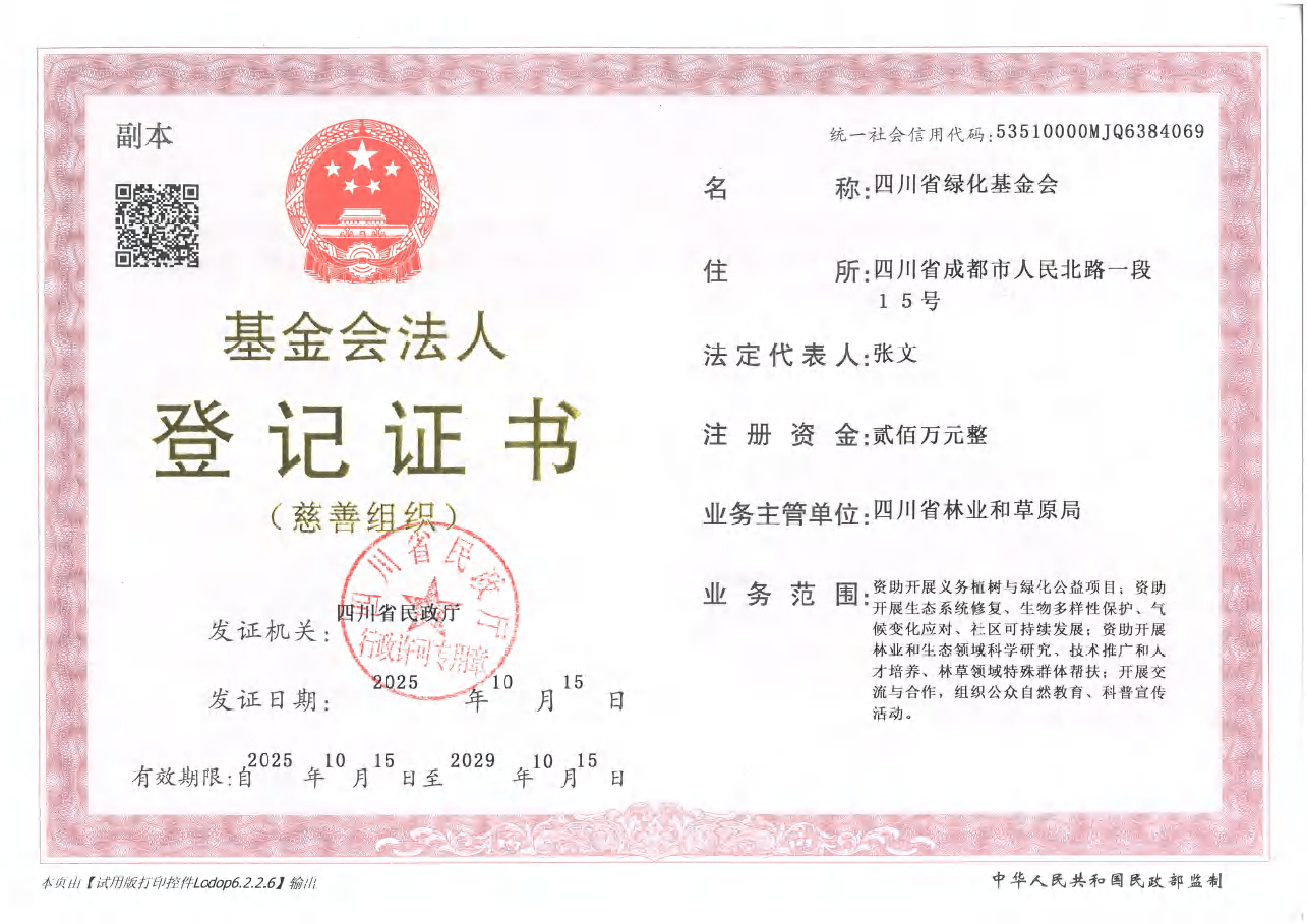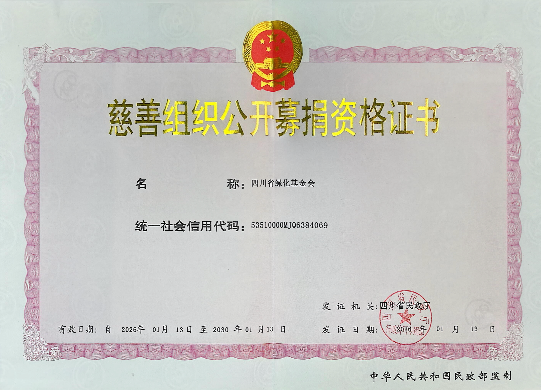 四川省绿化基金会(SGF)是2017年3月在四川省民政厅注册,四川省林业和草原局为业务主管单位的公开募捐慈善组织,是4A级社会组织。