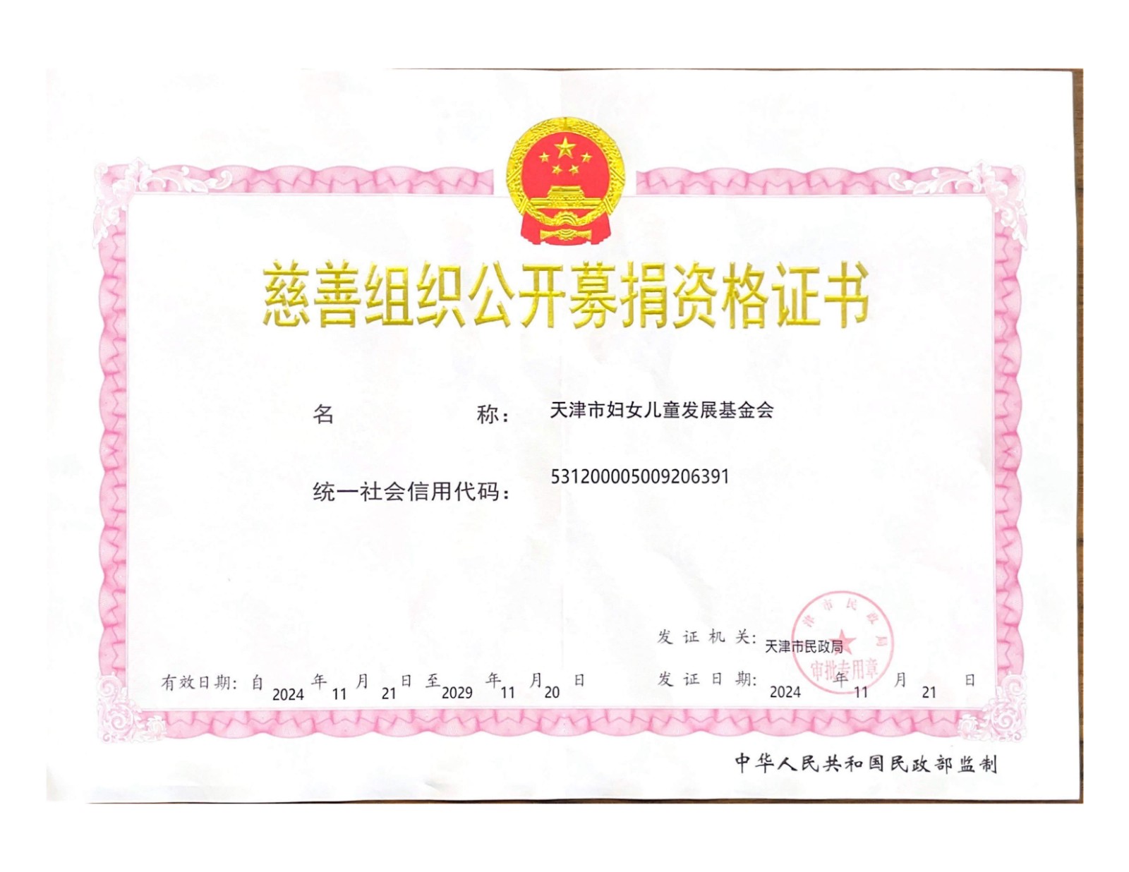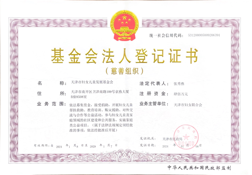 善款将由天津市妇女儿童发展基金会接收
