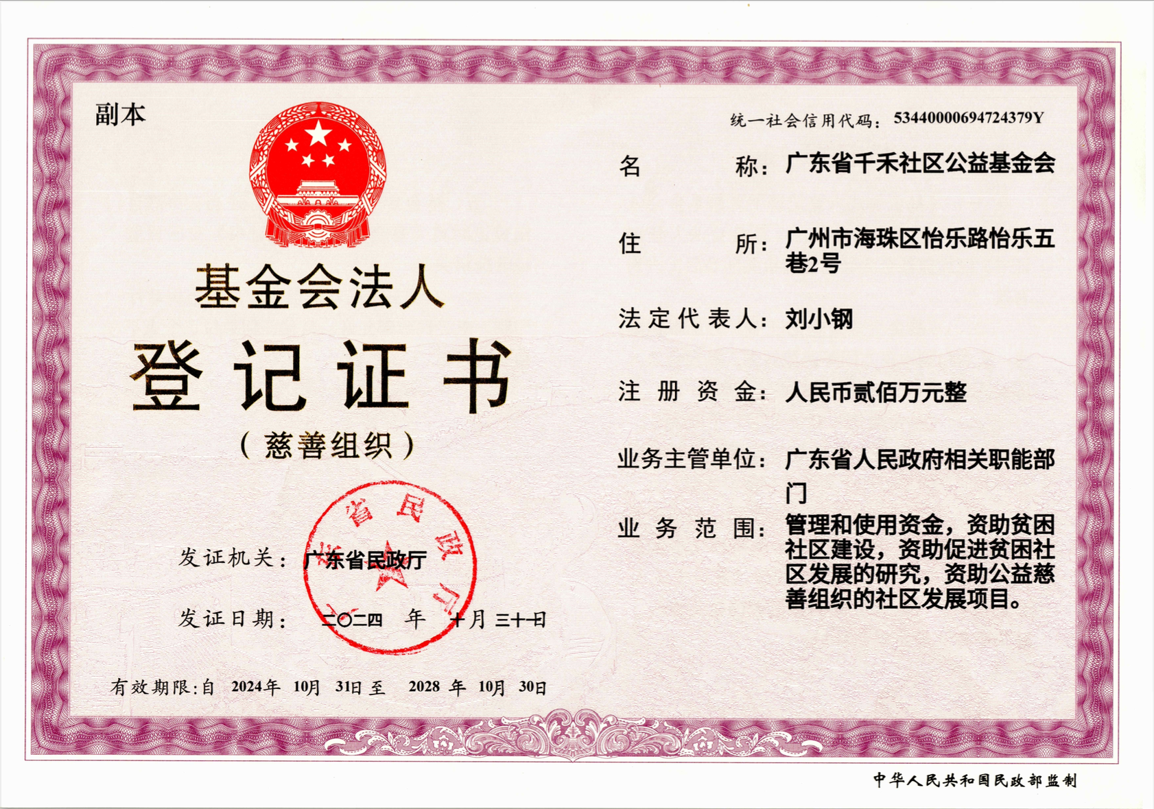 2009年,一群怀抱公益理想的企业家学者携手成立了中国第一家以“社区”命名的基金会——千禾社区基金会(简称“千禾”)。千禾是首批获得广东省民政厅认定的慈善组织之一,并于2017年获得广东省民政厅颁发的5A级基金会荣誉。